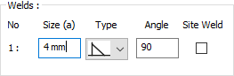 Welds ![]() The thickness, type and angle values of the welds to be made at the connections are given. The information on whether it will be done on the construction site or not is entered. |
