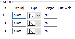 Welds ![]() The thickness, type and angle values of the welds to be made at the connections are given. The information on whether it will be done on the construction site or not is entered. |