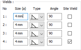Welds ![]() The thickness, type and angle values of the welds to be made at the connections are given. The information on whether it will be done on the construction site or not is entered. |