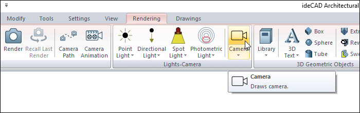 You can access it under the ribbon menu Rendering tab, Lights-Camera title in the architectural program.