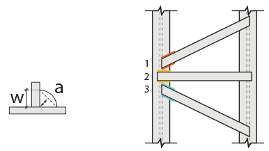 In the design data, the connection elements material is defined. The condition that the main element in the weld joint has less strength than the weld strength is controlled.