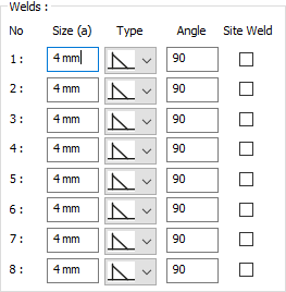 Welds ![]() The thickness, type and angle values of the welds to be made at the connections are given. The information on whether it will be done on the construction site or not is entered. |