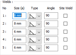 Welds ![]() The thickness, type and angle values of the welds to be made at the connections are given. The information on whether it will be done on the construction site or not is entered. |
