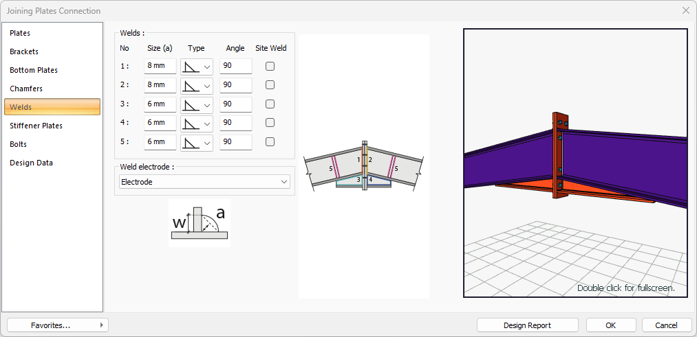 In the design data, the connection elements material is defined. The condition that the main element in the weld joint has less strength than the weld strength is controlled.