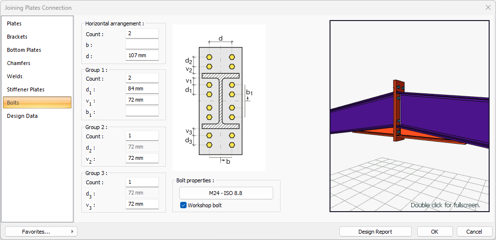 Group 3 ![]() Distance values of bolts to beam and other bolts are entered. The values to be entered are shown in the schematic drawing. |