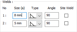 Welds ![]() The thickness, type and angle values of the welds to be made at the connections are given. The information on whether it will be done on the construction site or not is entered. |