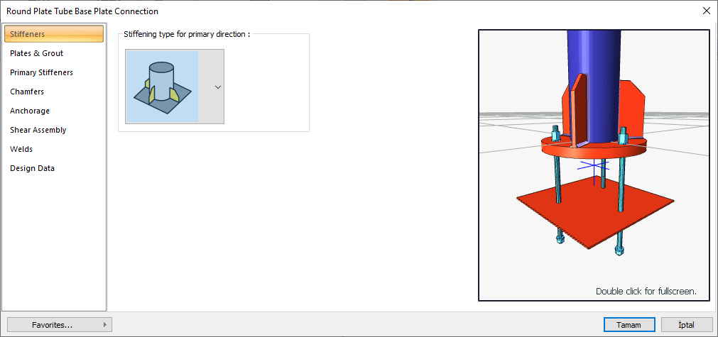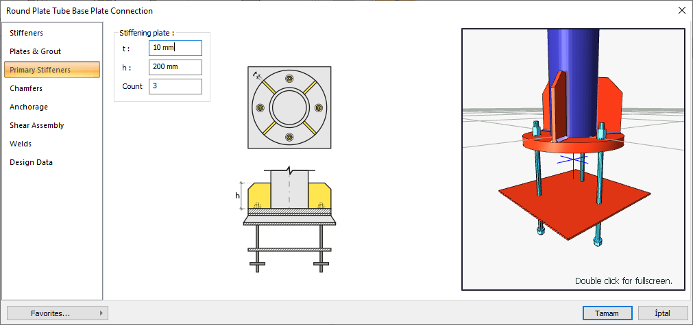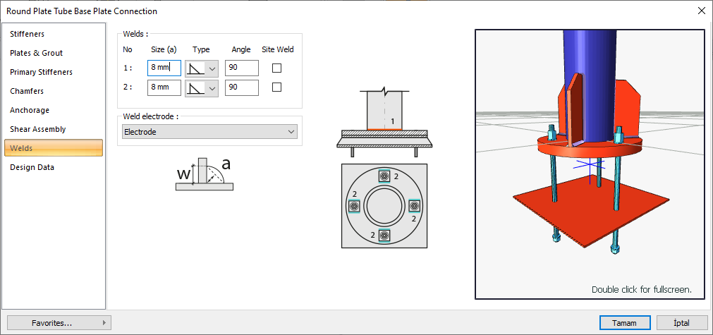 Welds ![]() The thickness, type and angle values of the welds to be made at the connections are given. The information on whether it will be done on the construction site or not is entered. |