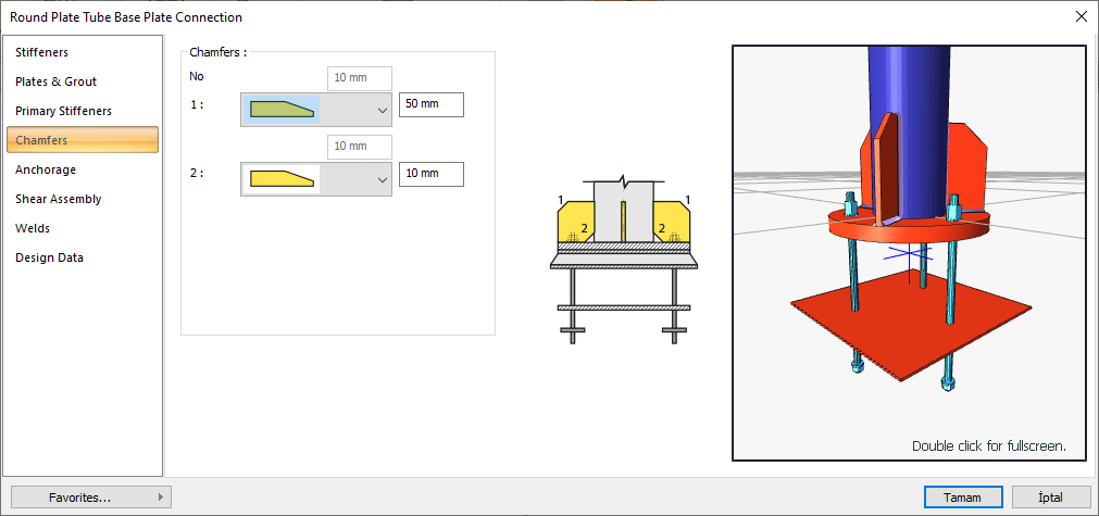 Chamfers ![]() For easy assembly of the plates in the field, the use of slope, slope type and geometric properties are determined by entering the value. |
