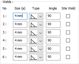 Welds ![]() The thickness, type and angle values of the welds to be made at the connections are given. The information on whether it will be done on the construction site or not is entered. |