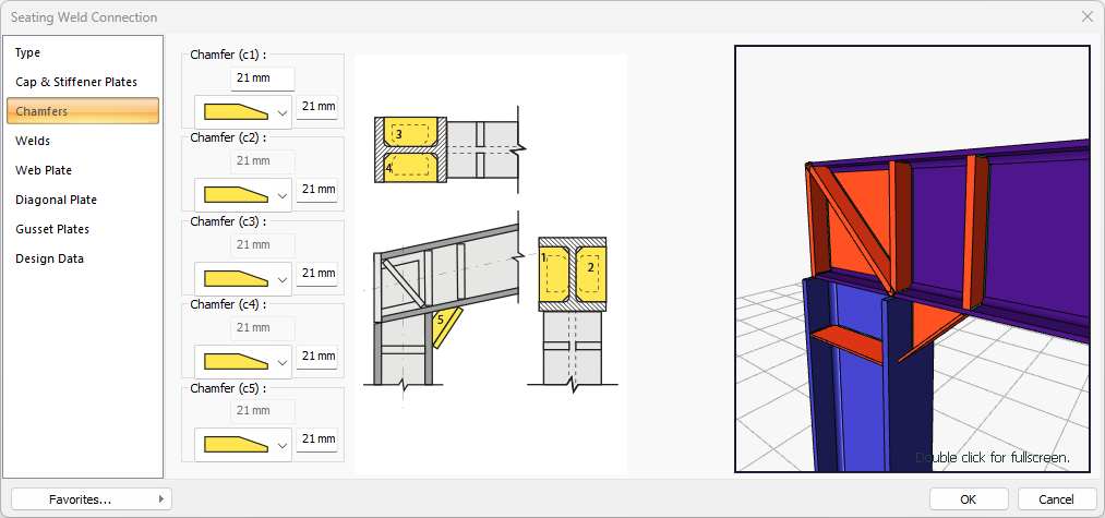 Welds ![]() The thickness, type and angle values of the welds to be made at the connections are given. The information on whether it will be done on the construction site or not is entered. |