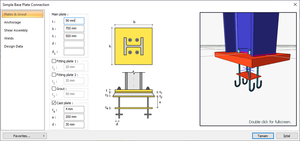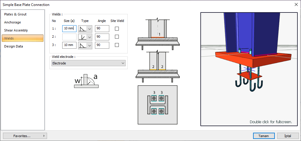 Welds ![]() The thickness, type and angle values of the welds to be made at the connections are given. The information on whether it will be done on the construction site or not is entered. |