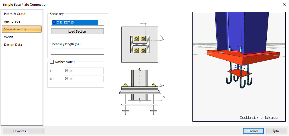 Shear key ![]() One of the ready-made profiles is selected from the list as a shear key. By clicking on the load section button, you can reach the ready section library and reach the list of American and European finished rolling sections and select from the list. |