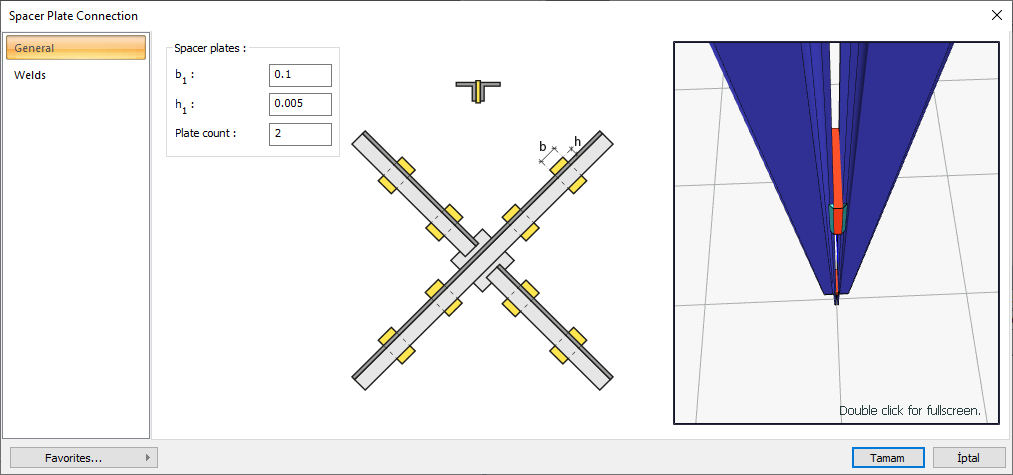 With the Spacer Plate command, the plates that connect the combined angle brackets are defined. When double angle brackets are used on braces, the spacers are placed automatically. When the spacer plates are double clicked, the connection properties are opened.