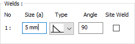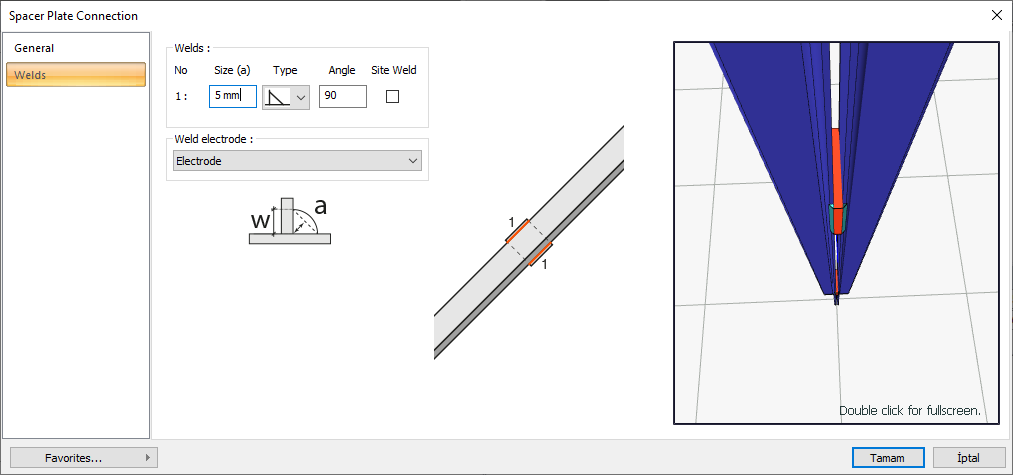 Welds ![]() The thickness, type and angle values of the welds to be made at the connections are given. The information on whether it will be done on the construction site or not is entered. |