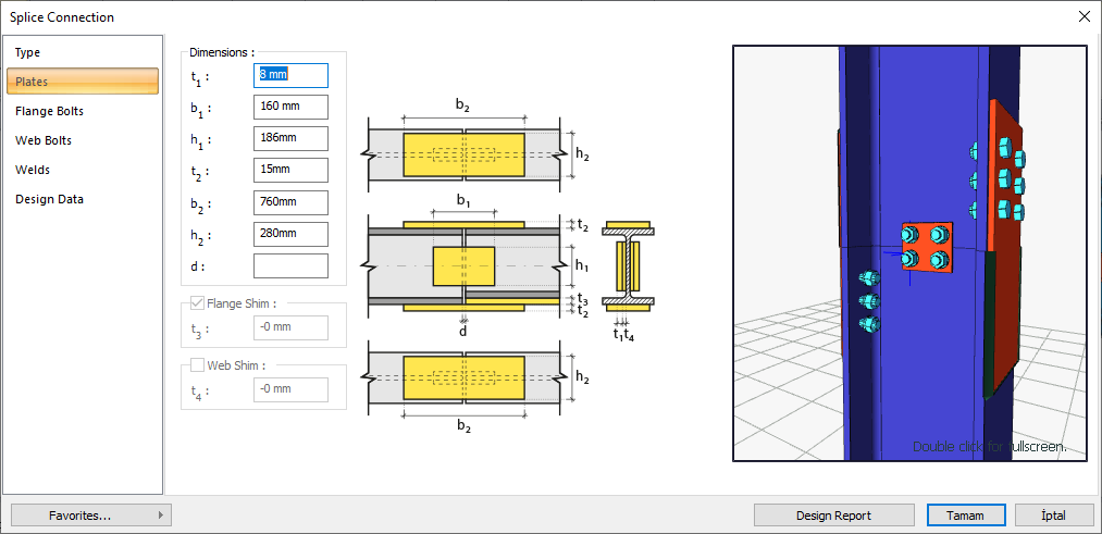 Web shim ![]() Shim is a plate placed between the elements to be connected in bolted connections. If shim is to be made, the option is selected and t 4 , thickness value is given. |