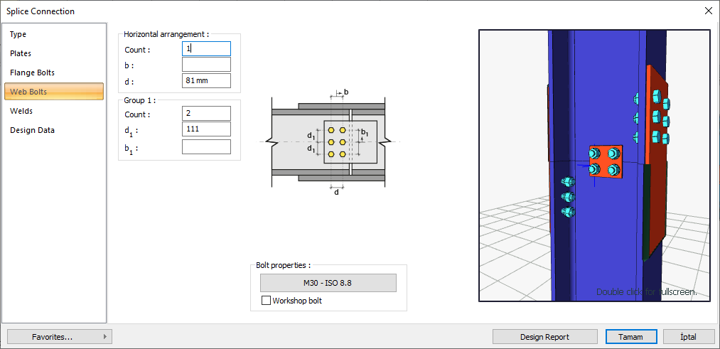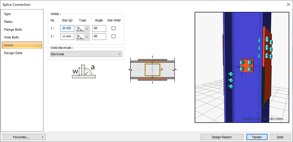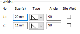 Welds ![]() The thickness, type and angle values of the welds to be made at the connections are given. The information on whether it will be done on the construction site or not is entered. |