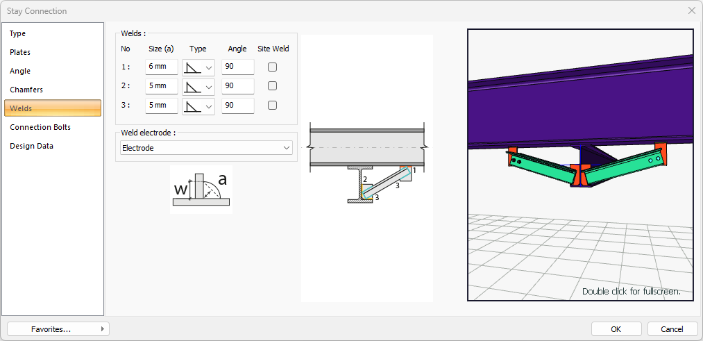 Welds ![]() The thickness, type and angle values of the welds to be made at the connections are given. The information on whether it will be done on the construction site or not is entered. |