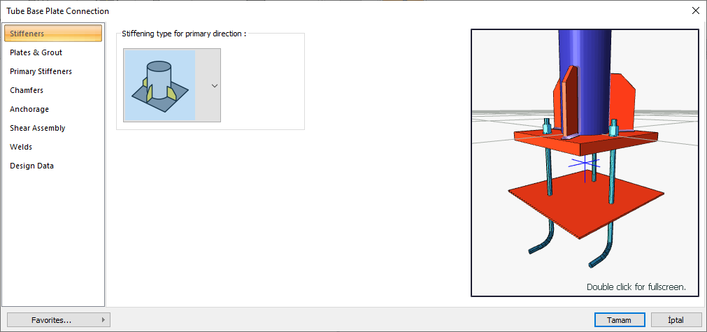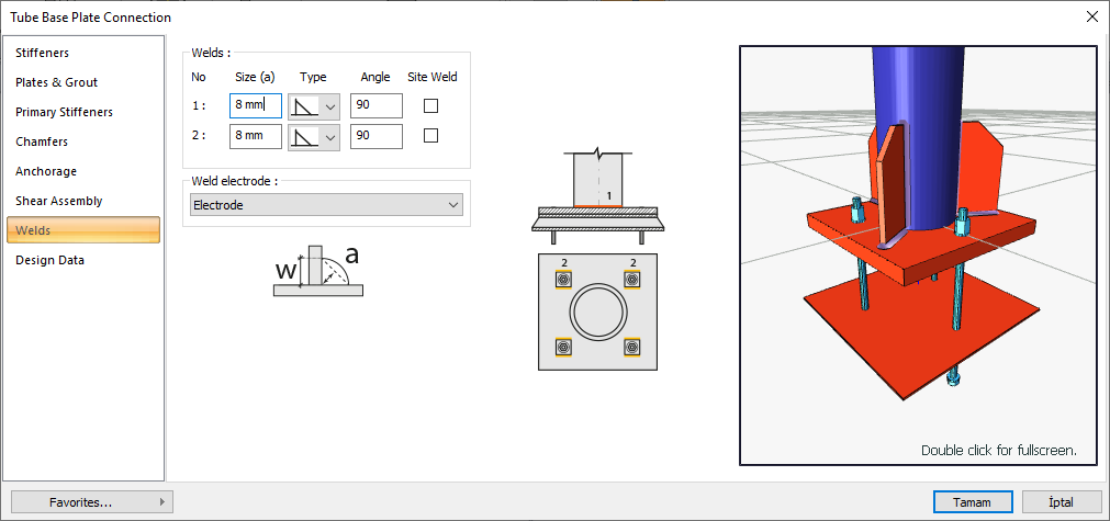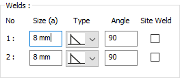 Welds ![]() The thickness, type and angle values of the welds to be made at the connections are given. The information on whether it will be done on the construction site or not is entered. |