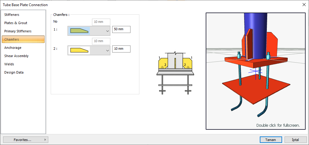 Chamfers ![]() For easy assembly of the plates in the field, the use of slope, slope type and geometric properties are determined by entering the value. |
