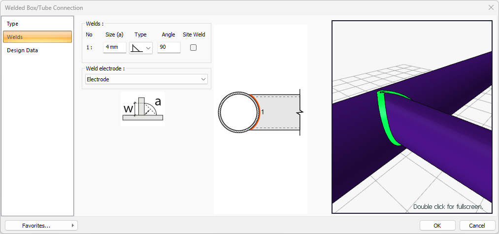In the design data, the connection elements material is defined. The condition that the main element in the weld joint has less strength than the weld strength is controlled.