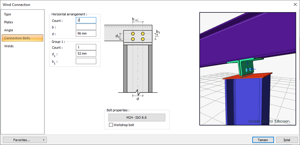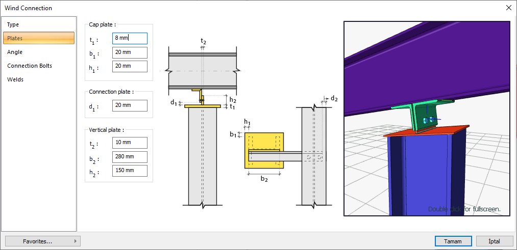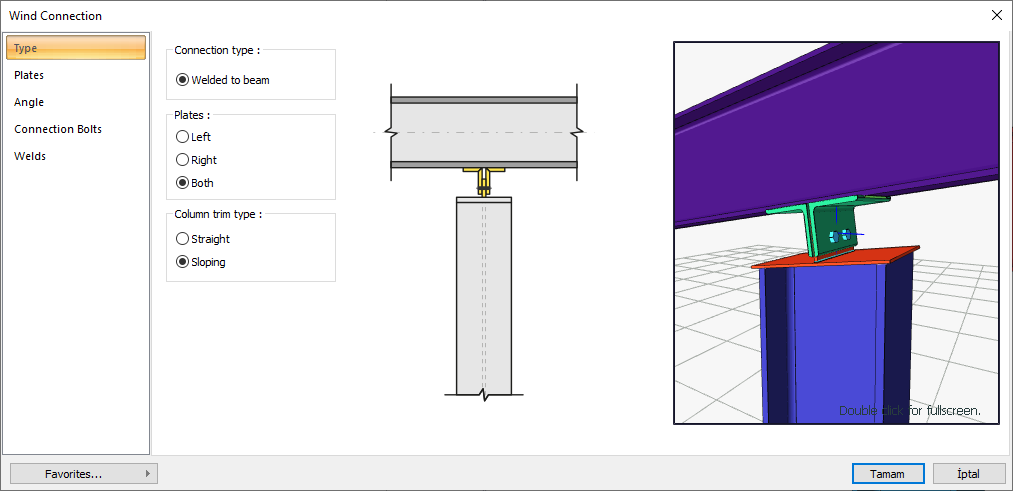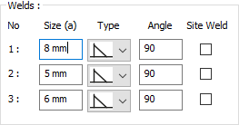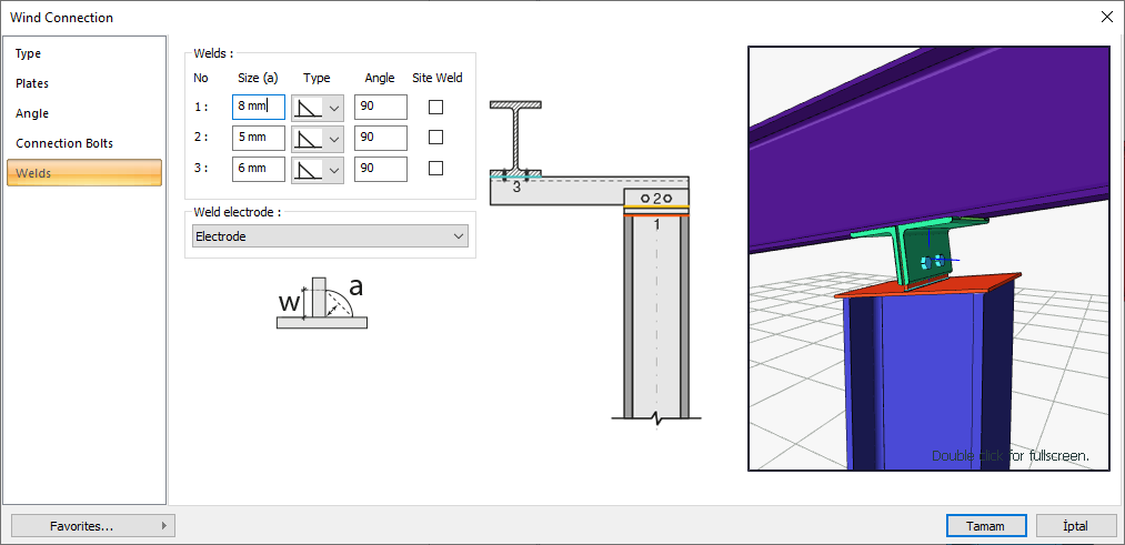 Welds ![]() The thickness, type and angle values of the welds to be made at the connections are given. The information on whether it will be done on the construction site or not is entered. |