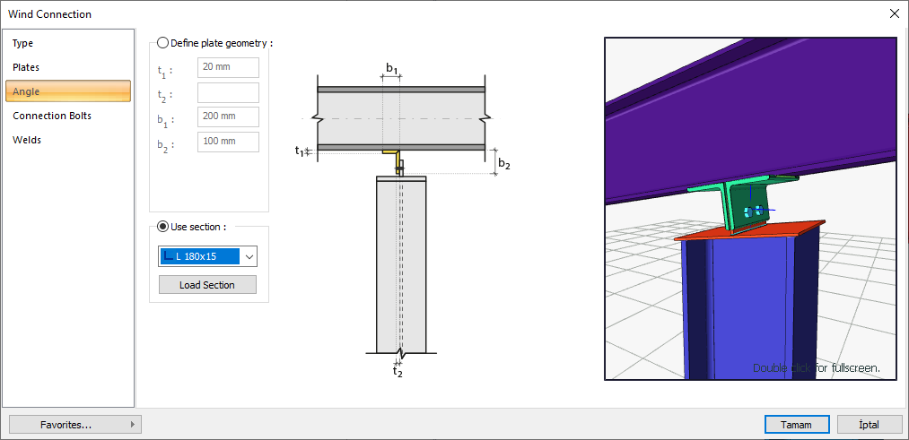 Use section ![]() By selecting the option, one of the ready-made L profiles is selected from the list as an angle. By clicking on the load section button, you can reach the ready section library and reach the list of American and European finished rolling sections and select from the list. |