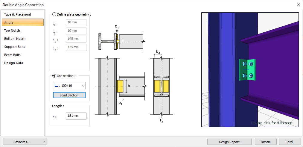 Use section ![]() By selecting the option, one of the ready-made L profiles is selected from the list as an angle bracket. By clicking on the load section button, you can reach the ready section library and reach the list of American and European finished rolling sections and select from the list. |