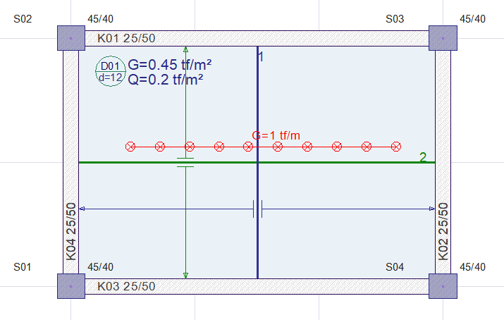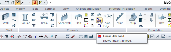 The Linear Slab Load command is defined a linear load (wall, parapet, etc.) on the slab. The load values of the linear slab load are defined in the Point-Linear Load Settings dialog.
