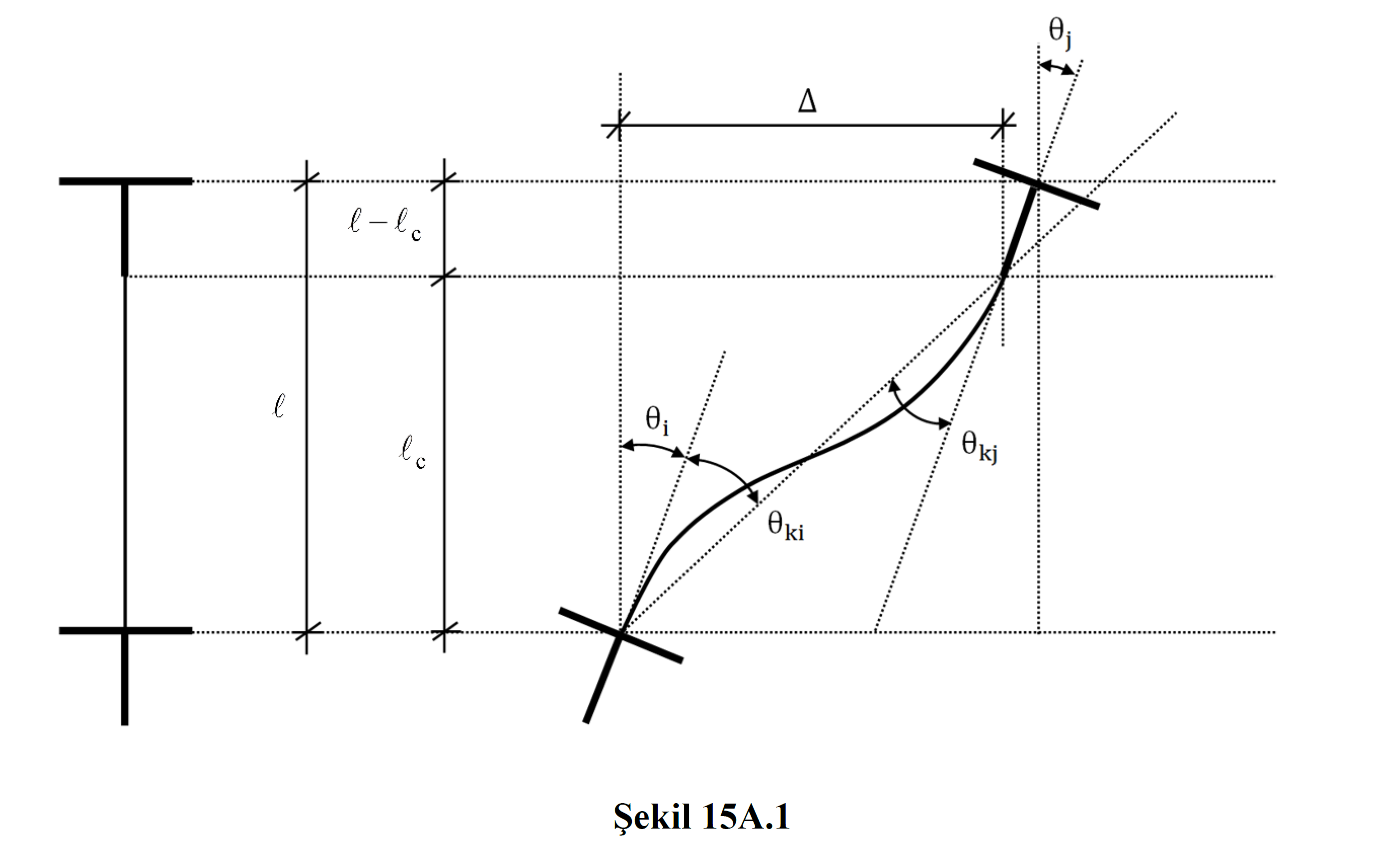 The deformation properties of a typical bending element under double curvature bending are shown in Figure 15A.1 . Here, l is the total length of the element, l c is the net span, Δ is the displacement between floors, θ i and θ j are the rotations of joints i and j, respectively, θ ki and θ kj are the displaced axis rotations at the ends i and j, respectively.