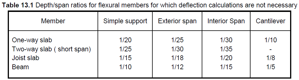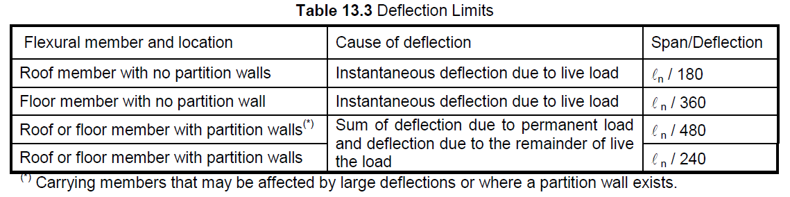 Allowable maximum deflections for flexural members are given in Table 13.3: ln is the clear span.