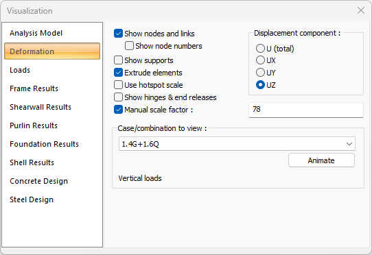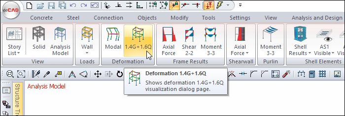 You can access the Deformation tab by clicking either Modal or 1.4G + 1.6Q commands under the Deformation heading under the ribbon menu Analysis and Design Display tab .