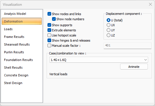 Displacement component to view ![]() The displacements of the structure are shown if it is selected from the options U (total), UX (x direction), UY (y direction), UZ (z direction). |
