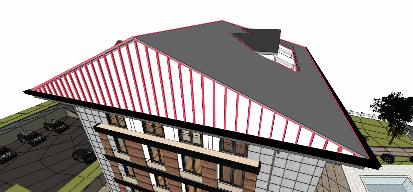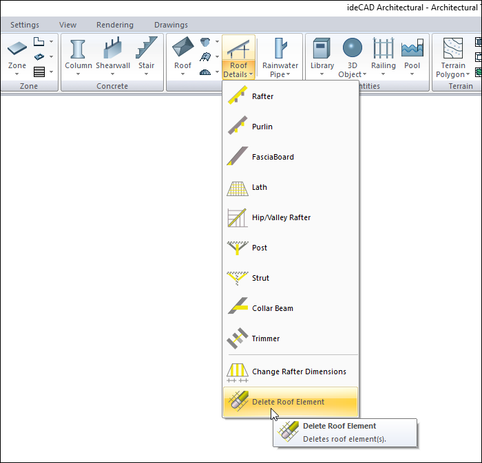 The created roof detail elements (purlin, rafter, ridge, etc.) are deleted with the Delete Roof Element command.