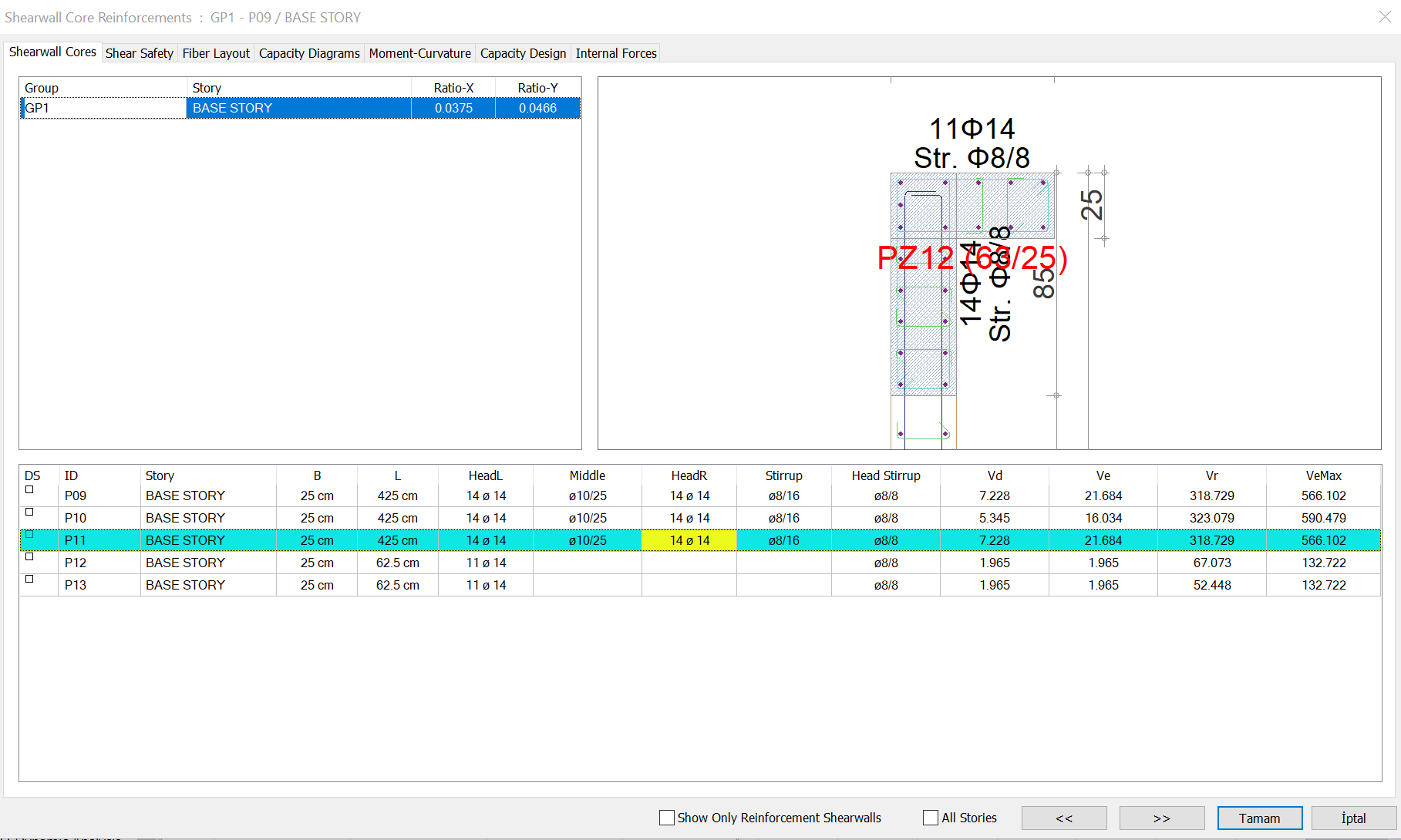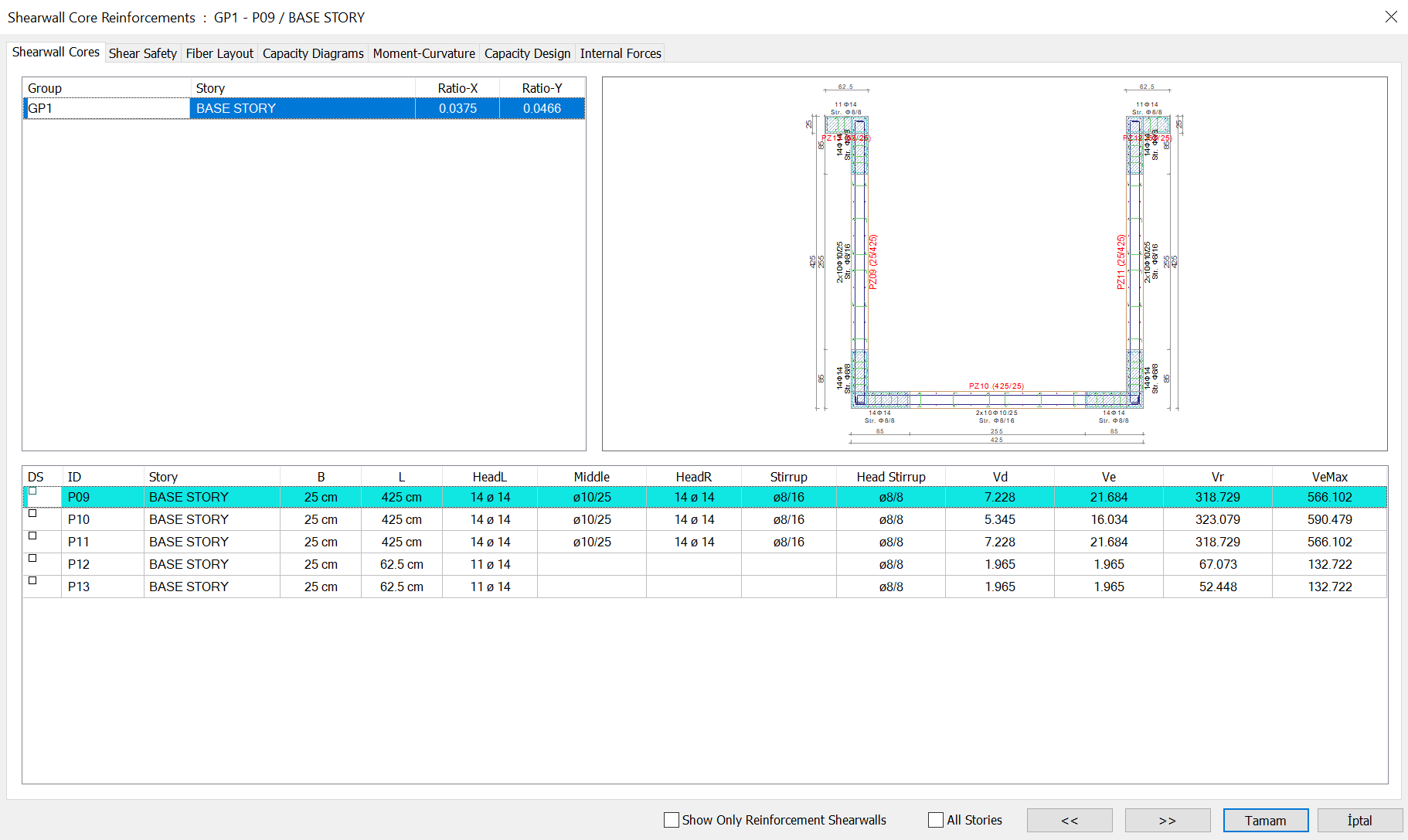 After the analysis, the shearwall design results can be seen in the Shearwall Core Reinforcement dialog.