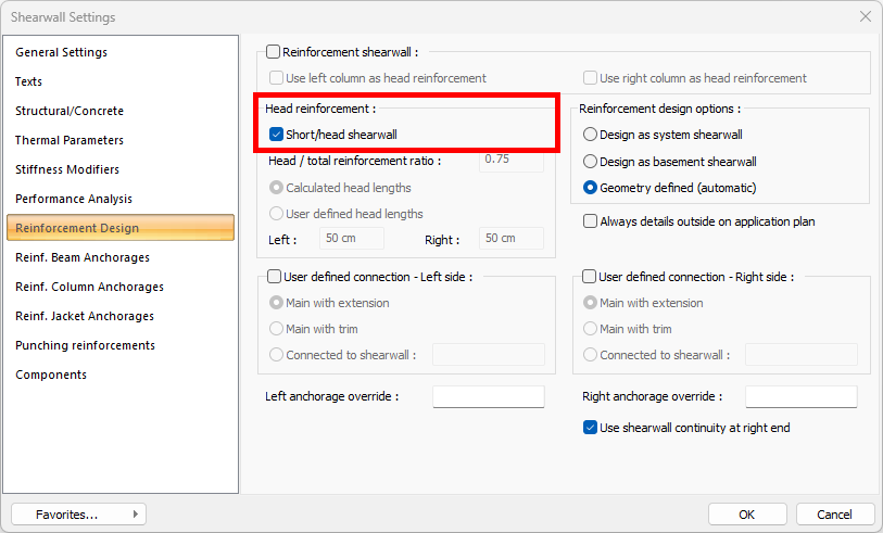 Under Head Reinforcement, activate the short/head shearwall option.