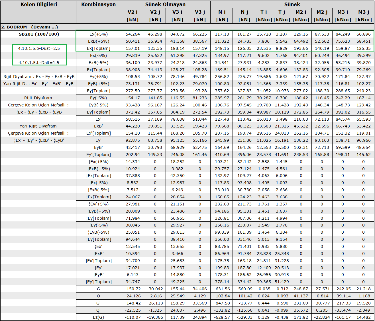 For example, after the analysis of the 2nd basement floor S01 column in the above table, the calculation of the internal forces based on the design is given. If we examine the EX direction in detail, the V2 (i) calculation for non-ductile behavior is as follows: