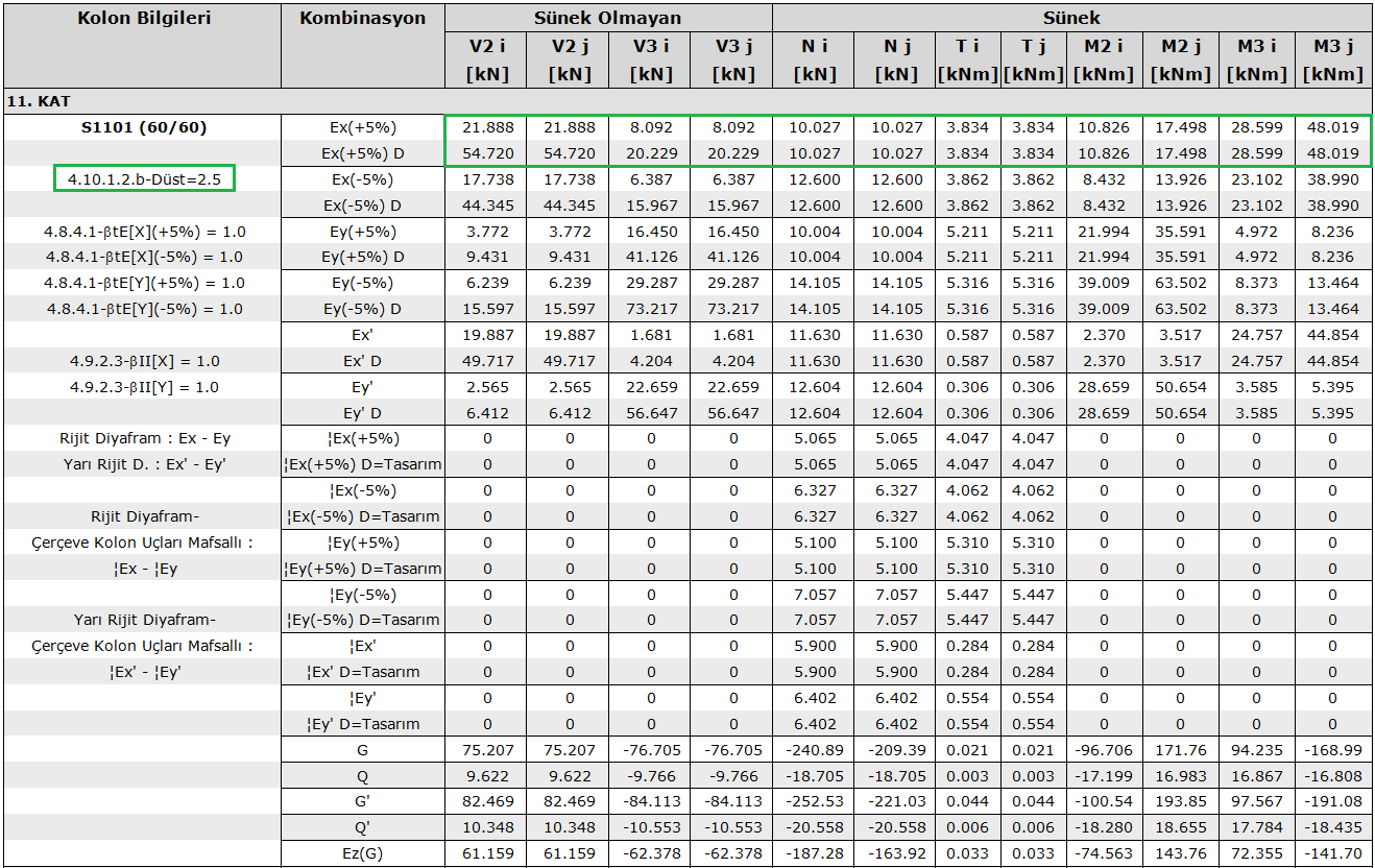 For example, after the analysis of the 11th floor S01 column in the above table, the calculation of internal forces based on the design is given. If we examine the EX direction in detail, the V2 (i) calculation for non-ductile behavior is as follows: