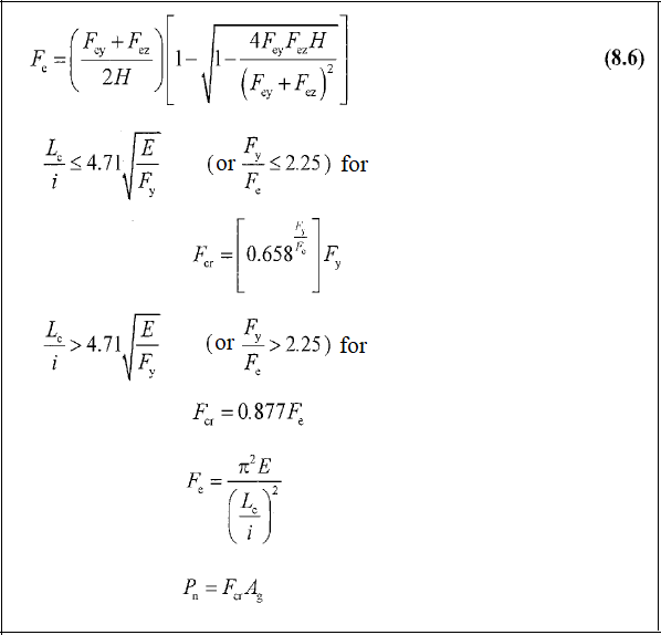 The torsional buckling limit state occurs when the element rotates around its longitudinal axis (positive (+) shaped built-up elements or channel cross-section that are compressive elements consisting of 4 equal leg angle placed back to back) and the elastic buckling stress Fe is calculated by equation 8.5.