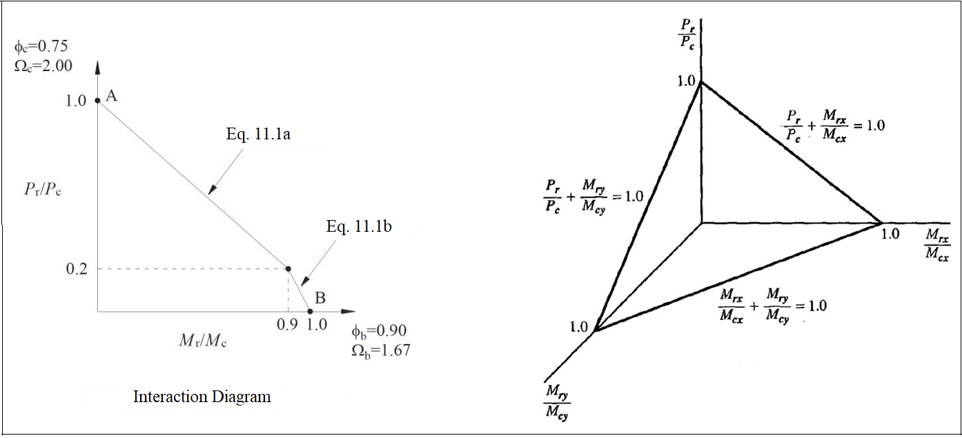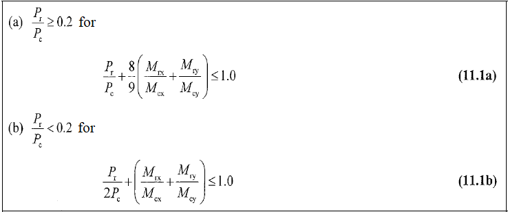 Equation 11.1 is used for double and single symmetrical members under the combined effect of compression and biaxial flexural moment.