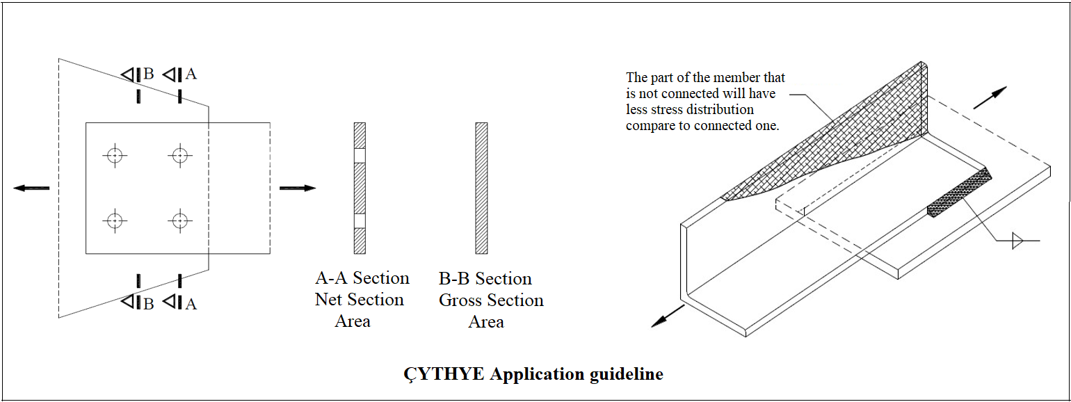 The design tensile strength is taken as the minimum strength to be calculated according to the yield limit state, rupture limit state and block shear limit state of the member under axial tensile force. Block shear limit situation used in connections of tensile members is given in ÇYTHYE 2018 Section 13.4.3. Block break limit state is an additional check for connections.