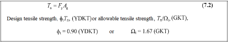 The characteristic tensile strength Tn for the yielding limit state in tensile members is calculated by equation 7.2 using the gross cross-section area.
