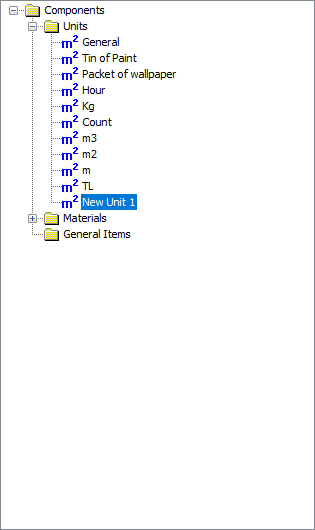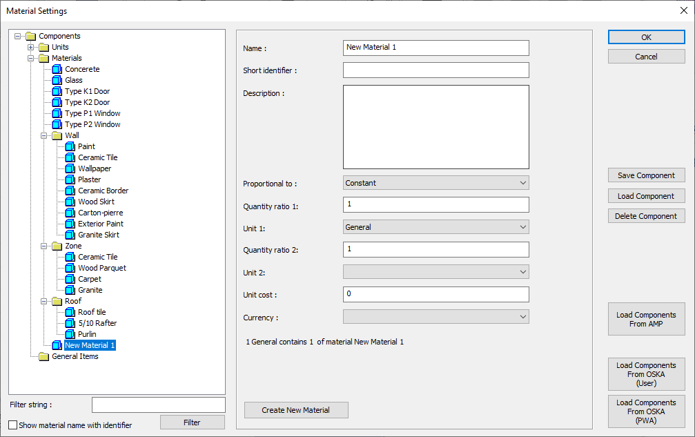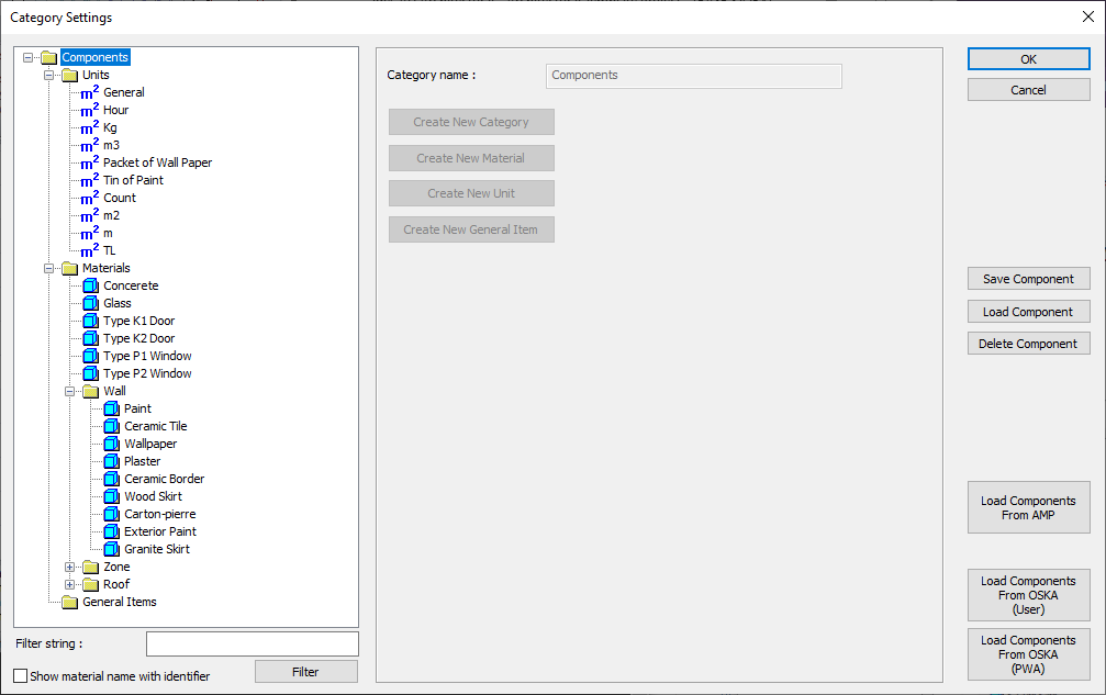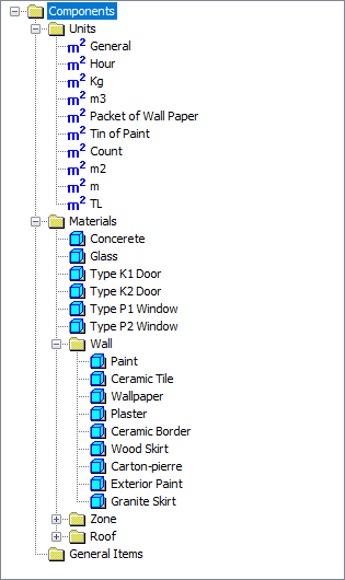 Components are designed by defining the units and materials to be used in the quantity with the Design Components command for detailed quantities . The name, unit and size (volume, length, area etc.) of the materials are determined.