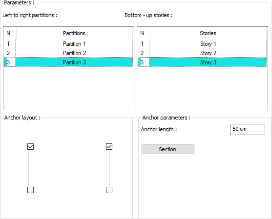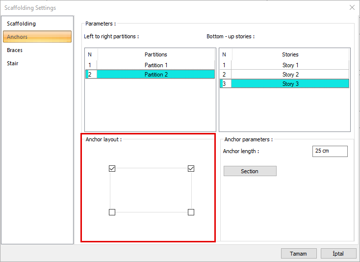 Anchor settings can be made separately for all partitions in the scaffolding. You can select stories from the bottom-up stories section. You can select the partitions in the selected stıories from the left to right partitions section. If you select by holding down the Ctrl key, you can make multiple selections.