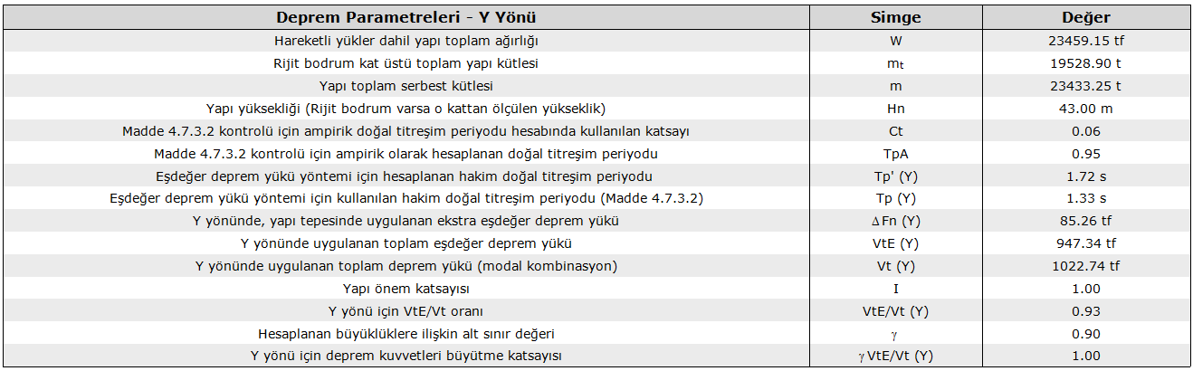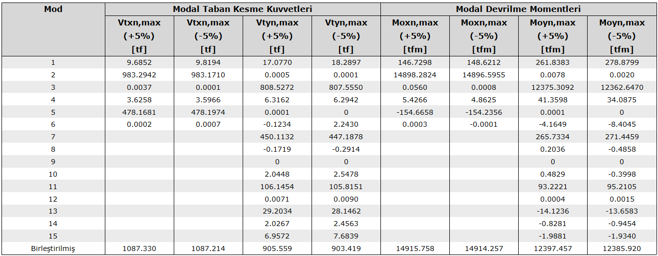 In the earthquake parameters table of the dynamic analysis report, the values used in the calculation for the relevant direction and the magnification coefficient obtained as a result of the calculation are given. In the Modal Base Shear Forces section of the earthquake regulation report, the base shear forces combined with the base shear force of each mode determined as a result of the modal analysis for each direction are given. Again, in the irregularities section of the earthquake regulation report, the coefficient γ E is automatically determined according to the presence of any of the A1, B2 and B3 irregularities .