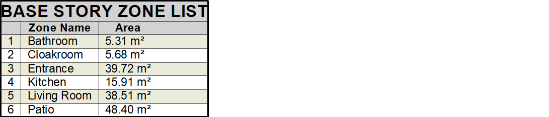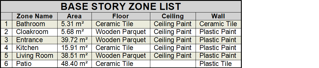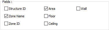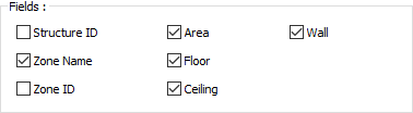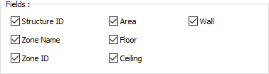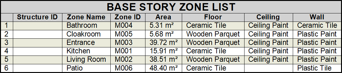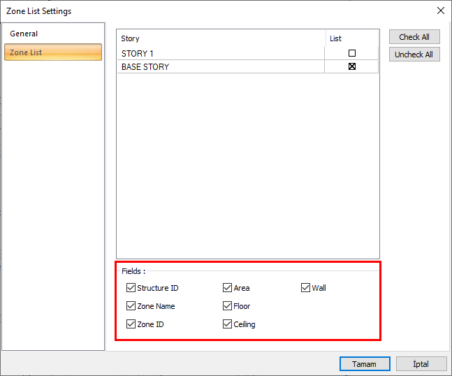 Fields settings, structure ID, zone name, zone ID, area, floor, ceiling and wall information are given in the zone list. The desired fields are marked in the zone list settings dialog.