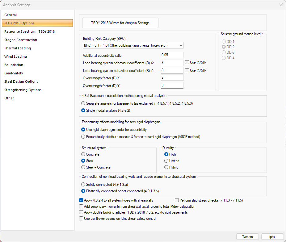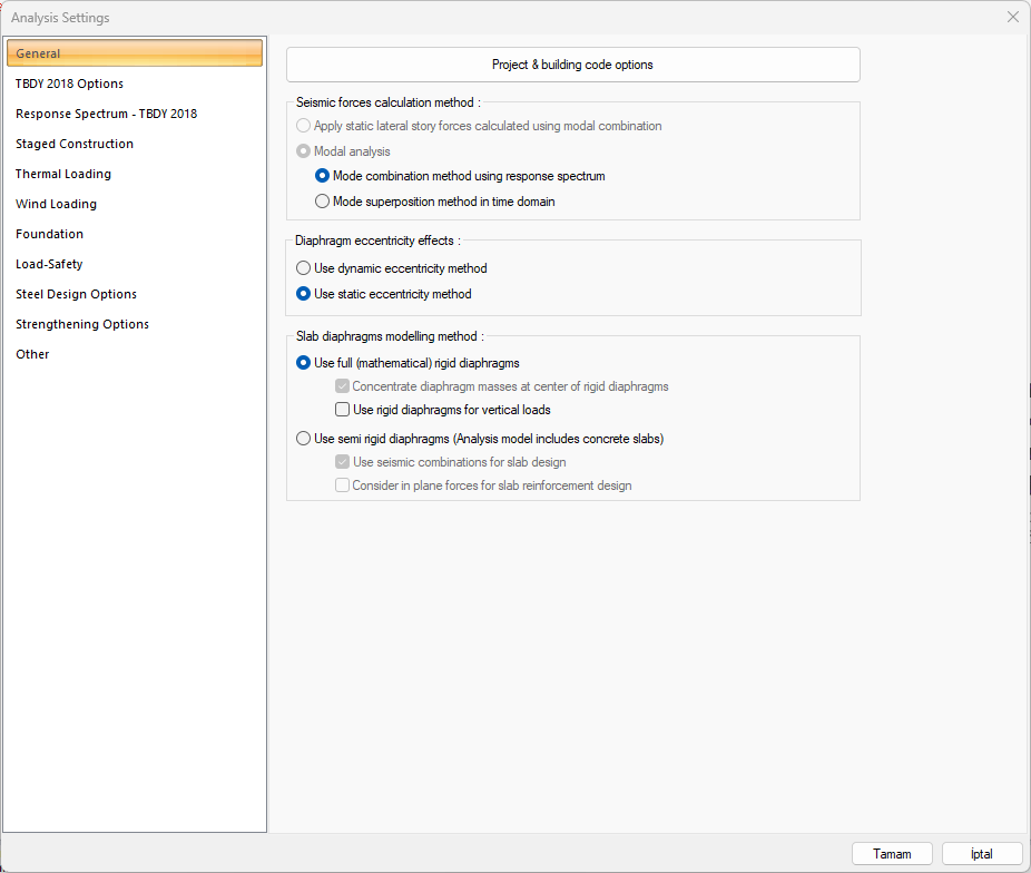 Since the building we are designing according to Table 4.4 is BYS=6, the equivalent earthquake load method can be used. The Modal Combination Method, which is inclusive and can be used in all buildings, has been used for design.