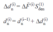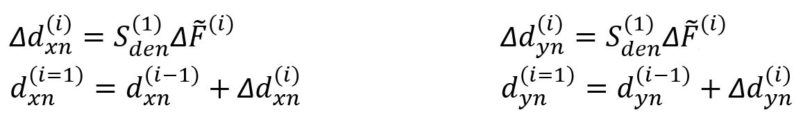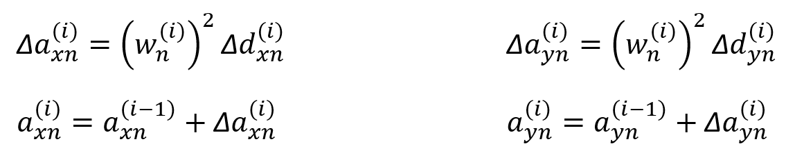 The modal displacement (displacement) increment, d n (i), is found by the equation shown below. The index "n" in the term Δd n (i) indicates the mode in which mode and the index (i) indicates the step in which step is processed.