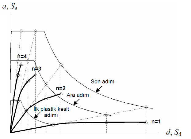 ARSA method is a displacement controlled pushover analysis method. In the method, the modal displacement increments are scaled according to the nonlinear spectral displacement value obtained according to the instantaneous dynamic characteristics of the structure. In the previous step, in order to find the modal scaling value in each nth vibration mode, the elastic spectral displacement of the system, the value from S (1), was found by using the equidistant displacement rule.
