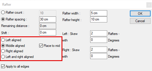 Place to mid ![]() If the middle aligned option is selected, the "Place to mid" option becomes active. If marked, one rafter is placed in the middle of the relevant roof surface and the other rafters are placed starting from this rafter. |