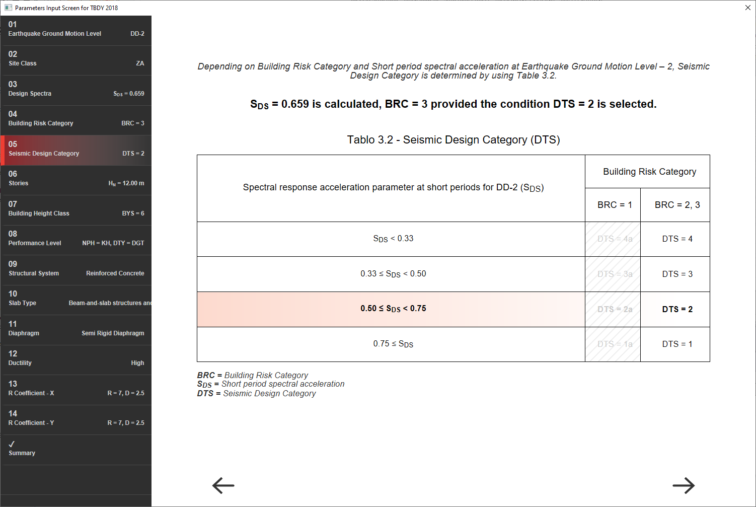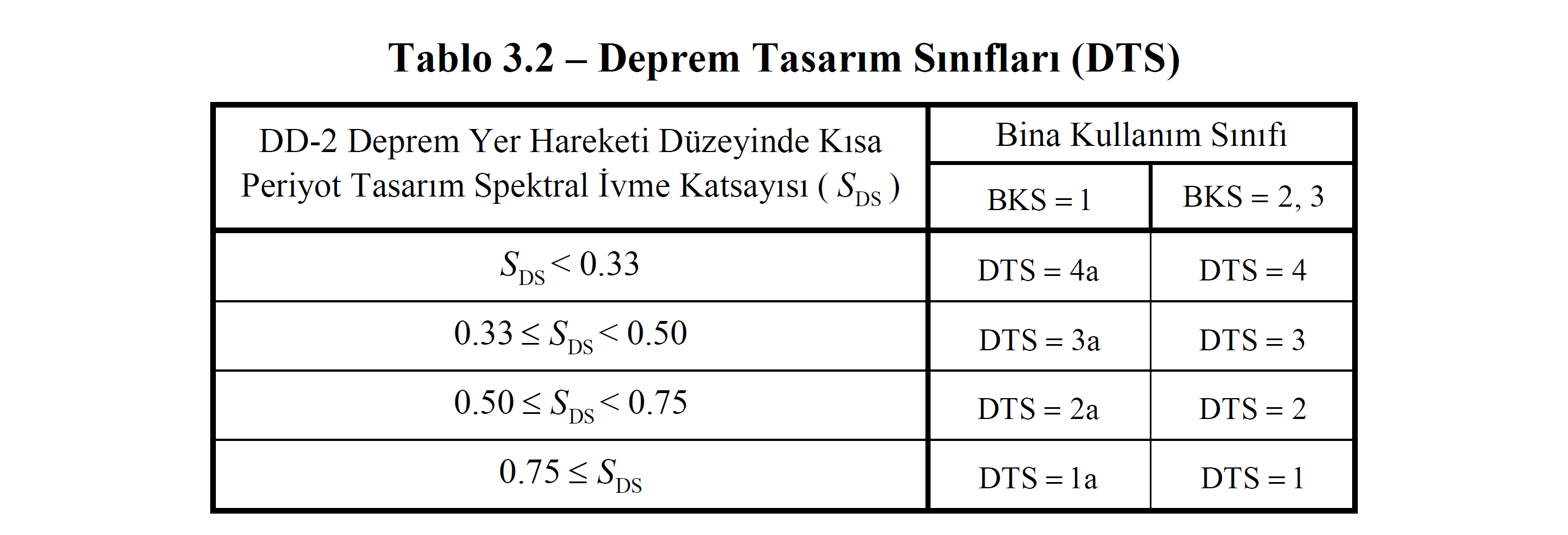 While the Design Based on Strength (DGT) approach is applied, the short-period design spectral acceleration coefficient defined in 2.3.2.2 for Building Use Classes (BKS) and DD-2 in accordance with Article 3.2 of the TBDY is determined according to Table 3.2 , based on S DS parameters . Earthquake Design Class (DTS) is determined.